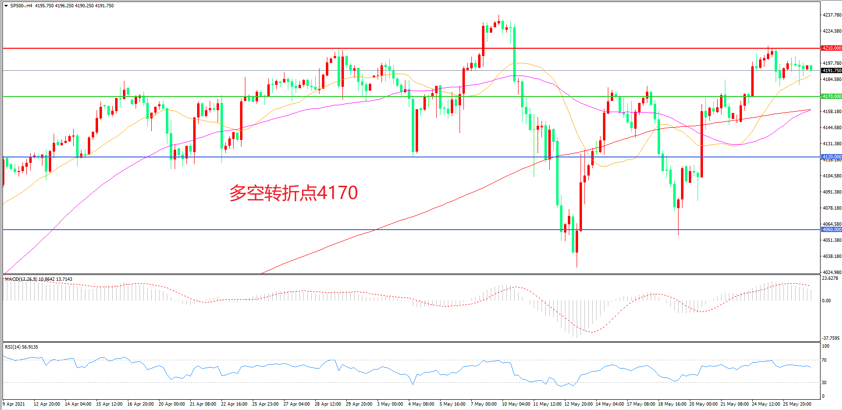 4小时图看,标普500呈现高位震荡,上行趋势暂缓,21周期均线成为短期支撑,MACD红柱缩短,RSI指标走平,日内震荡上行概率较大。