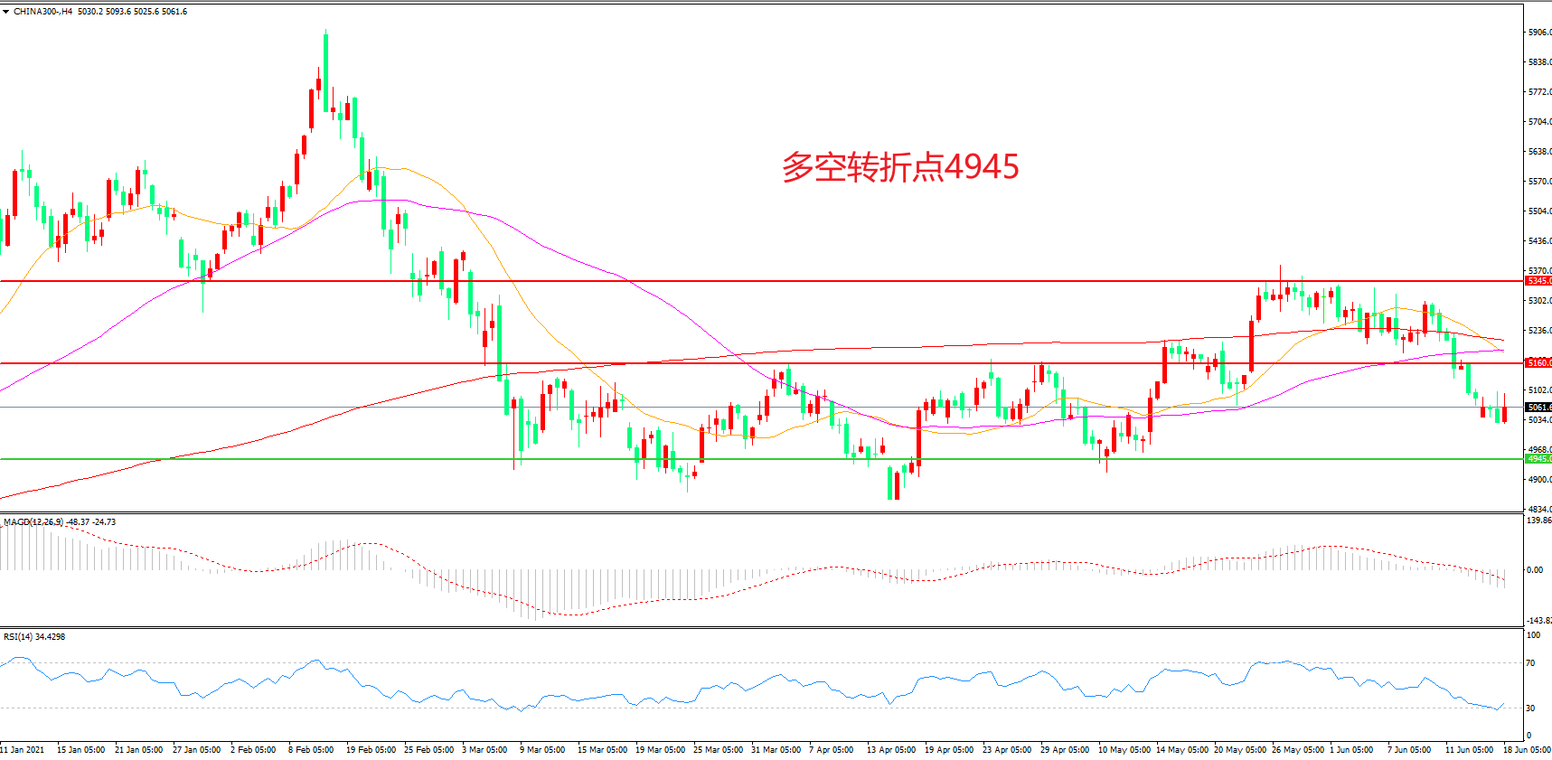 4小时图看,沪深300先跌后涨,短线跌势有所缓解,均线系统粘合成为上方阻力,4945成为短期多空分水岭,MACD绿柱增加,RSI指标走平,日内震荡反弹概率较大。