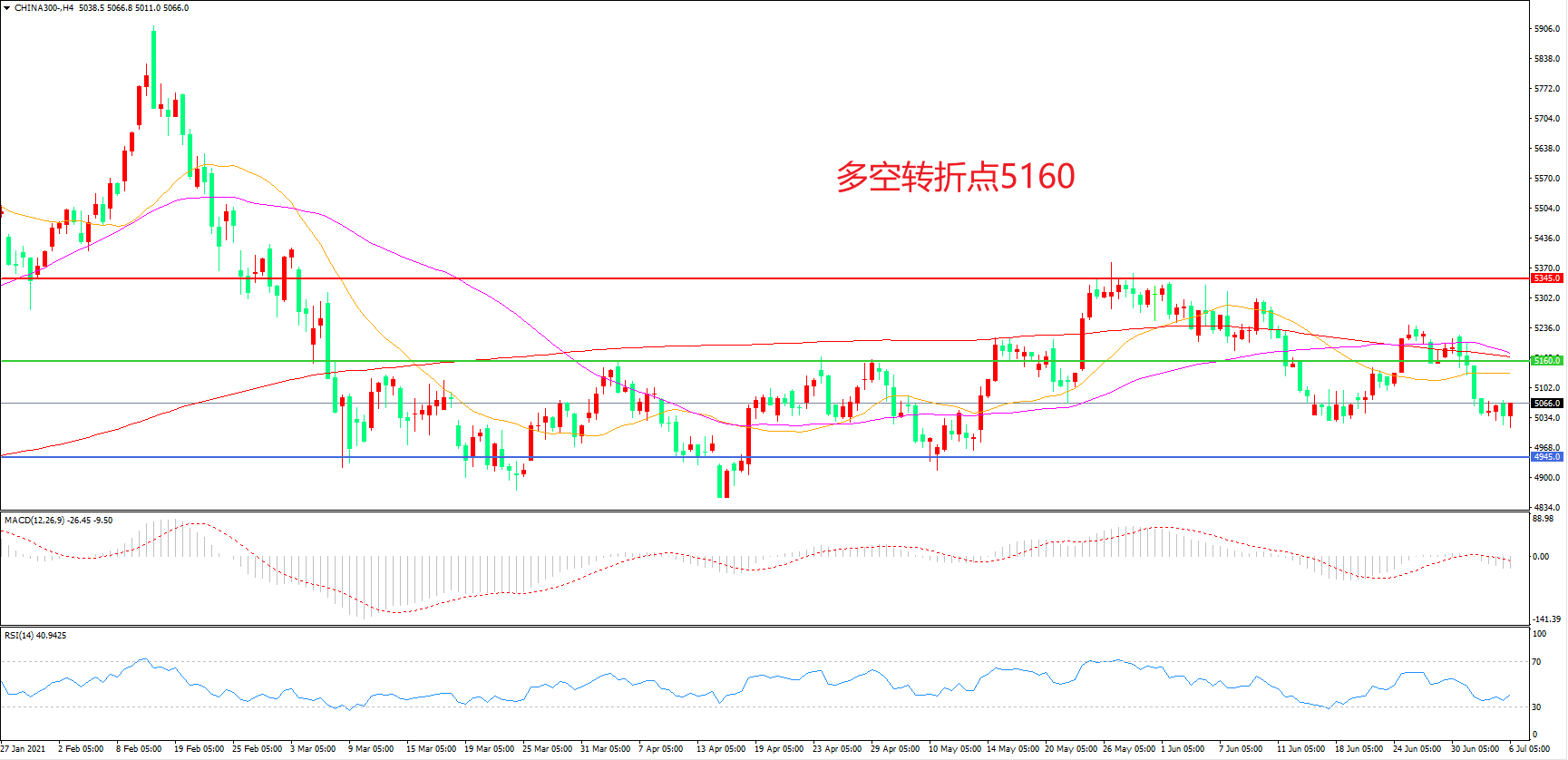 4小时图看,沪深300延续低位震荡,整体波幅不大,均线系统走平形成上方阻力,5160成为多空分水岭,MACD绿柱增加,RSI指标向上,日内延续震荡概率较大。