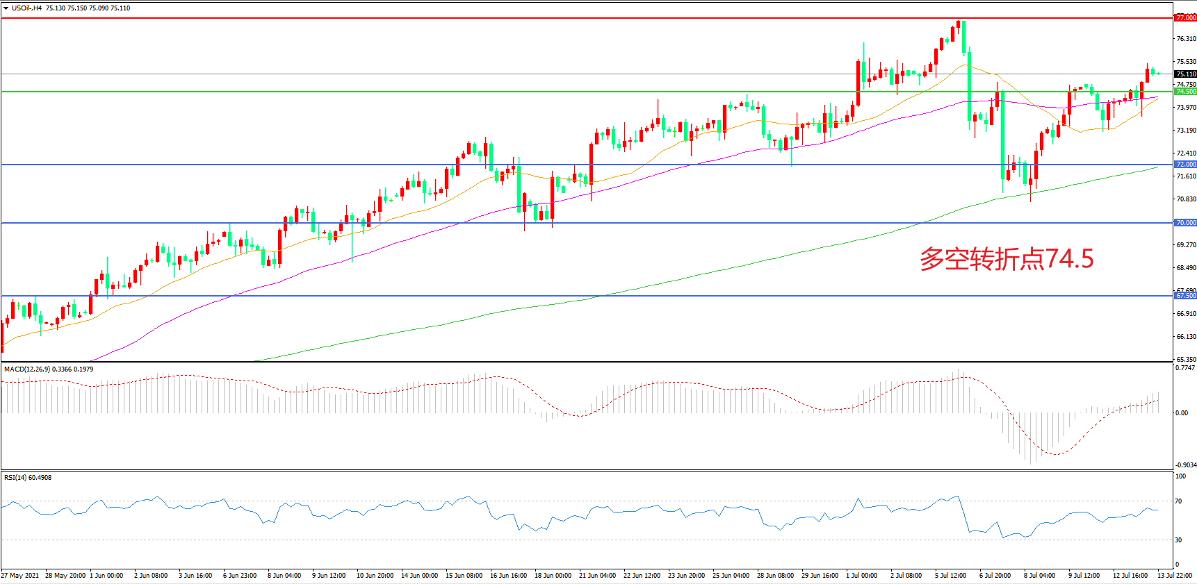 交易策略:在74.50之上看涨,目标77.00 80.00
