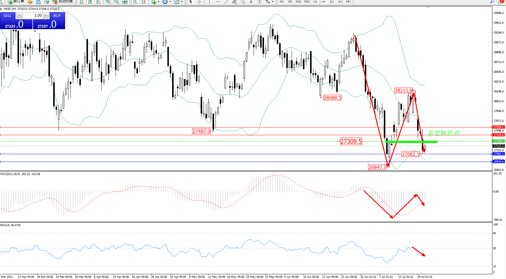 技术点评:空头动力延续布林带指标下轨附近持续下挫,低位抵达26847位置后拉升上扬,抵达28213位置后再度遇阻下挫,即将触及布林带指标下轨27082位置附近开始整理,短期空头动力有进一步向下移动态势,前期低位26847位置近在咫尺破位在即,布林带指标呈收口走势后开始有张口迹象,MACD指标处于空头区域短暂回升后再度下挫,RSI指标纠结于50均衡线附近整理后开始向下移动中;
