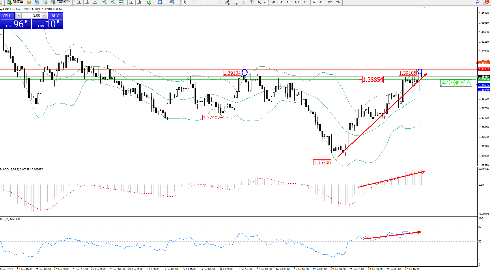 交易策略:1.38854上方看涨,目标1.39237、1.39477