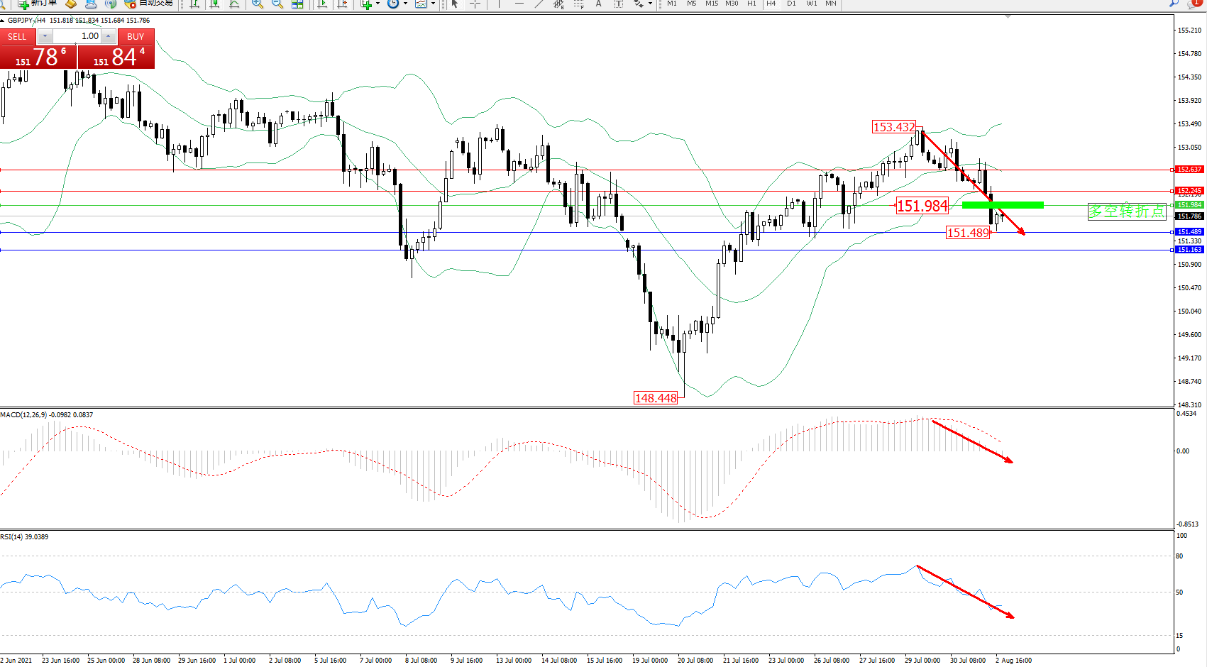 技术点评:高位空头动力维持窄幅震荡向下移动,跌破布林带指标下轨至151.489位置后得到短暂支撑,开始整理,布林带指标呈张口走势持续中,短期或有进一步向下移动态势,MACD指标处于空头动力弱势震荡下破0轴线进入空头区域徘徊,RSI指标呈阶梯式震荡下行进入空头区域整理中;
