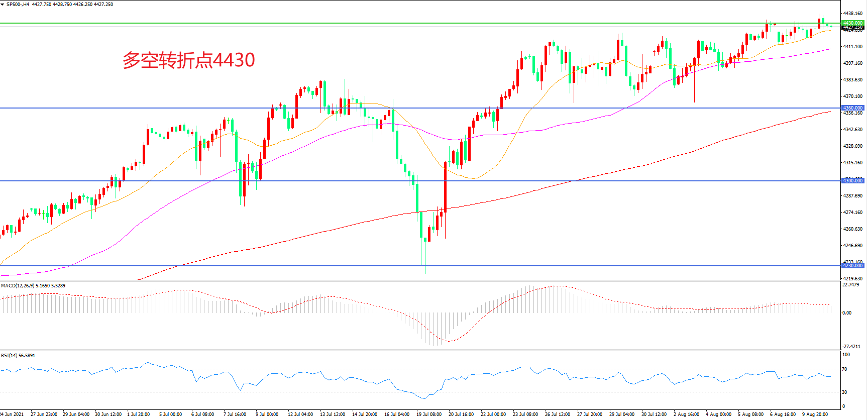 4小时图看,标普500以均线系统为支撑震荡上行,短期表现偏强,21周期均线成为下方支撑,4430成为多空分水岭,MACD红柱增加,RSI指标走平,日内震荡上行概率较大。