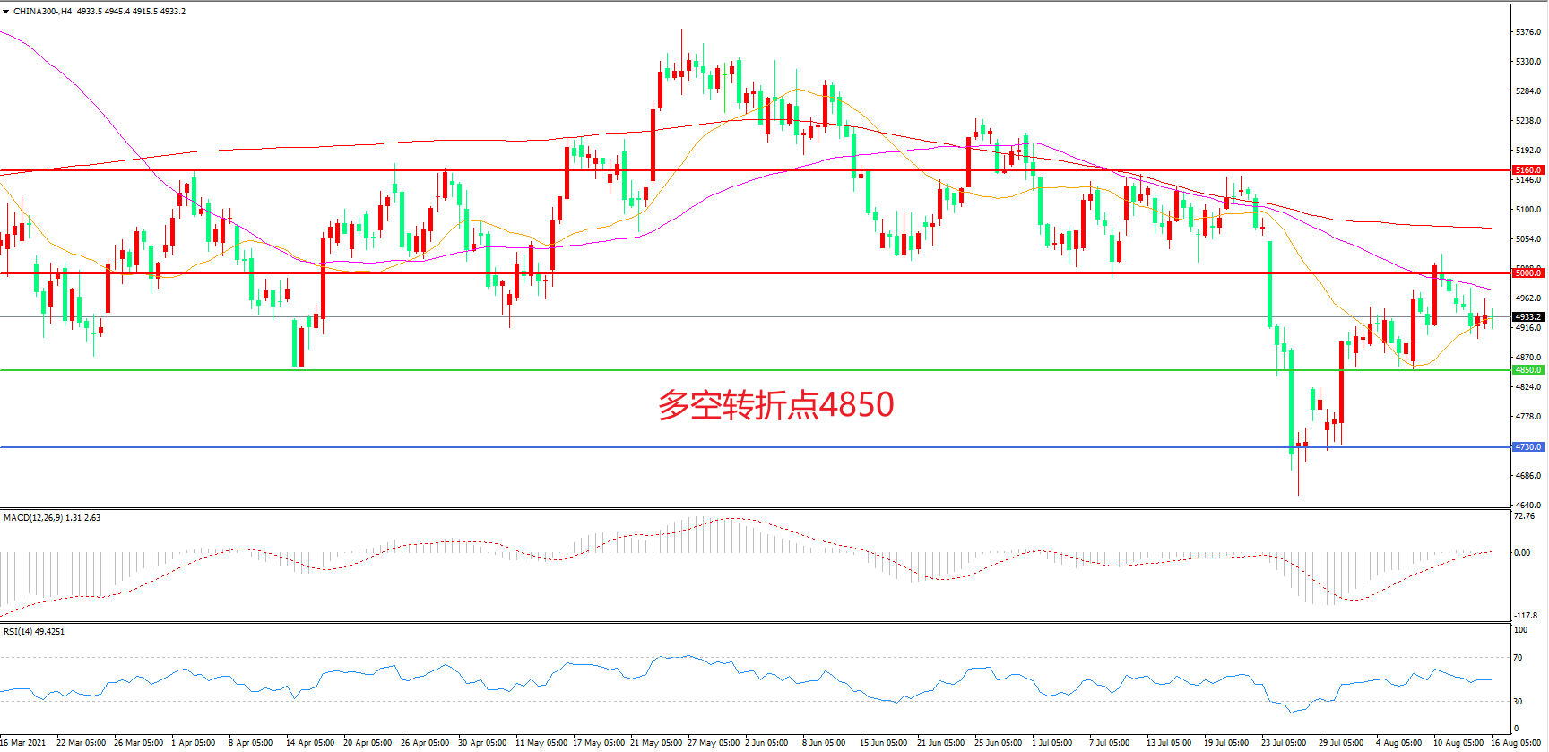 4小时图看,沪深300大幅反弹后受阻于5000点附近阻力,上行势头受阻,55均线成为短期阻力,21周期均线成为下方支撑,MACD绿柱缩短,日内延续震荡概率较大。