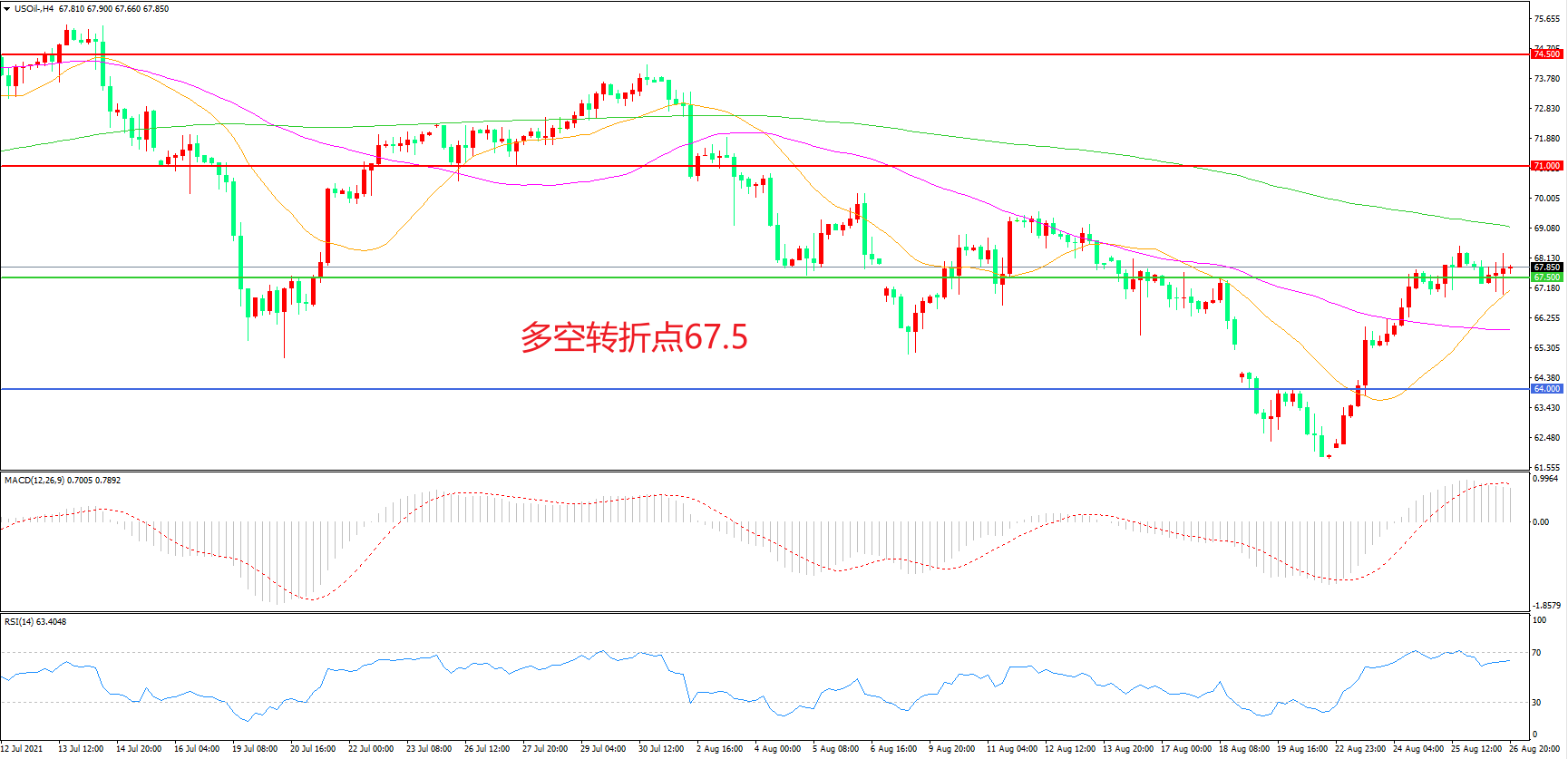周四(8月26日),在美联储主席鲍威尔杰克逊霍尔重磅讲话前日,美联储几大鹰派官员发表讲话,核心要点就是坚定的缩减QE,市场风险情绪受到影响,美国WTI原油震荡回落,收报67.50美元/桶。从供需来看,墨西哥油田近期就能够恢复产量,供给的中断仅仅是短期行为,不足以支撑价格连续大涨,下周就将迎来9月的OPEC月会议,市场情绪随时可能转向,价格的变动幅度会比较剧烈。