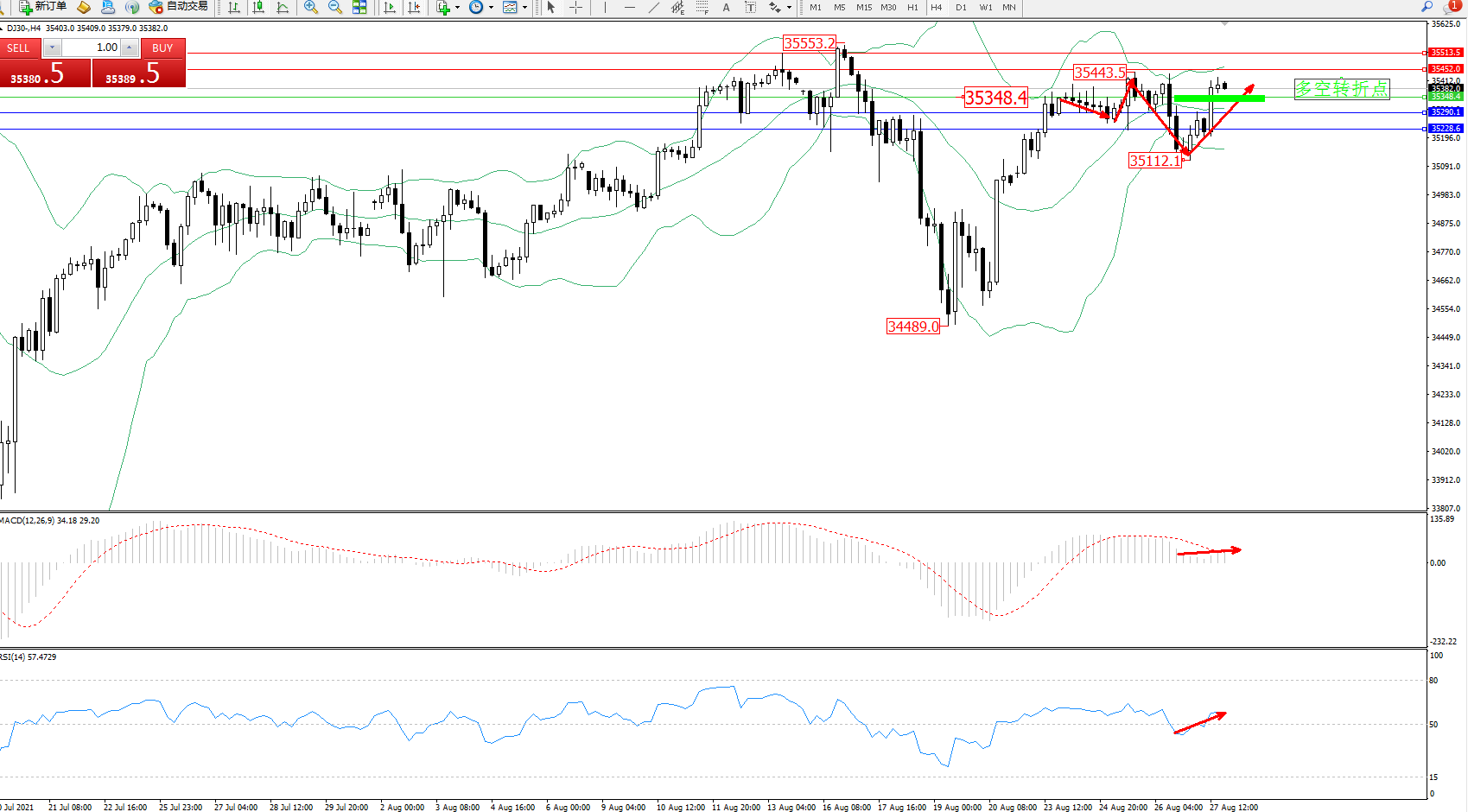 道琼斯指数8月27日(周五)收盘上涨241.69点,涨幅0.69%,报35454.81点;美国股市再创新高,美联储主席鲍威尔的讲话令投资者相信刺激措施将以渐进方式退出。年底前开始逐步缩减购债规模会比较适宜。,通胀率已经朝着美联储目标取得“实质性进一步进展”,劳动力市场也有了“明显进展”。鲍威尔的讲话预示美联储会以比较温和、有利于市场的方式来收紧货币政策,这让投资者松了一口气,从股市的表现看,主流投资者的观点是美联储会在秋季减码,等到明年年末或2023年年初再加息。