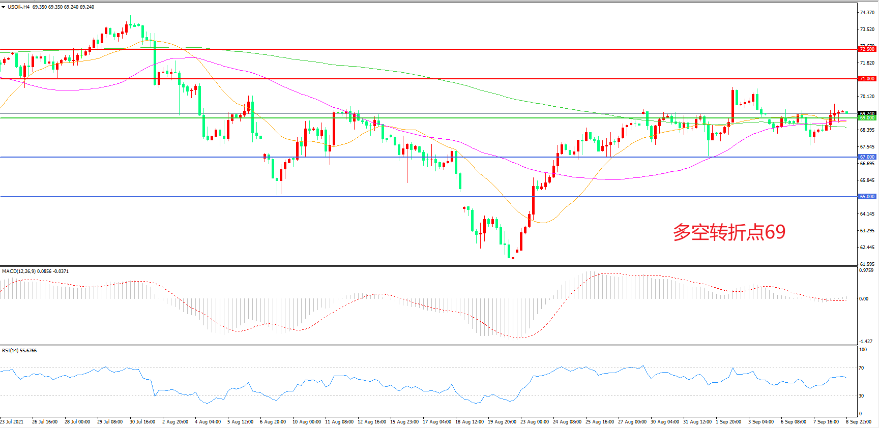 4小时图看,油价围绕着55周期均线窄幅震荡,69美元成为多空分水岭,均线系统形成下方支撑,MACD红柱增加,RSI指标走平,日内震荡上行概率较大。
