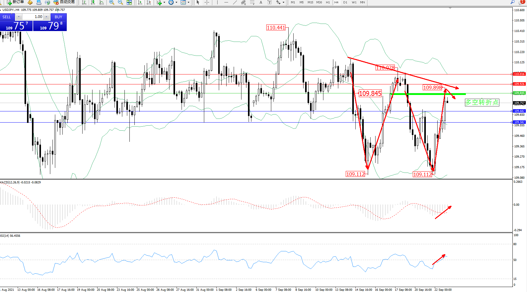 技术点评:长时间维持在布林带指标通道内呈宽幅震荡,低位多次触及109.112附近得到支撑后呈V型反转上移,高位空头压制下行趋势线依旧强劲,低位的拉升多次上扬遇阻,空头动力有伺机入场迹象,布林带指标呈持续宽幅震荡走势,MACD指标低位震荡缓慢上移至0轴线附近整理,RSI指标多头动力上移至50均衡线上方徘徊中;