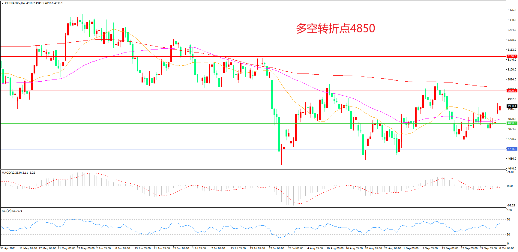 4小时图看,沪深300高开高走,整体表现较强,均线系统成为下方支撑,MACD绿柱缩短,RSI指标向上,日内震荡上行概率较大。