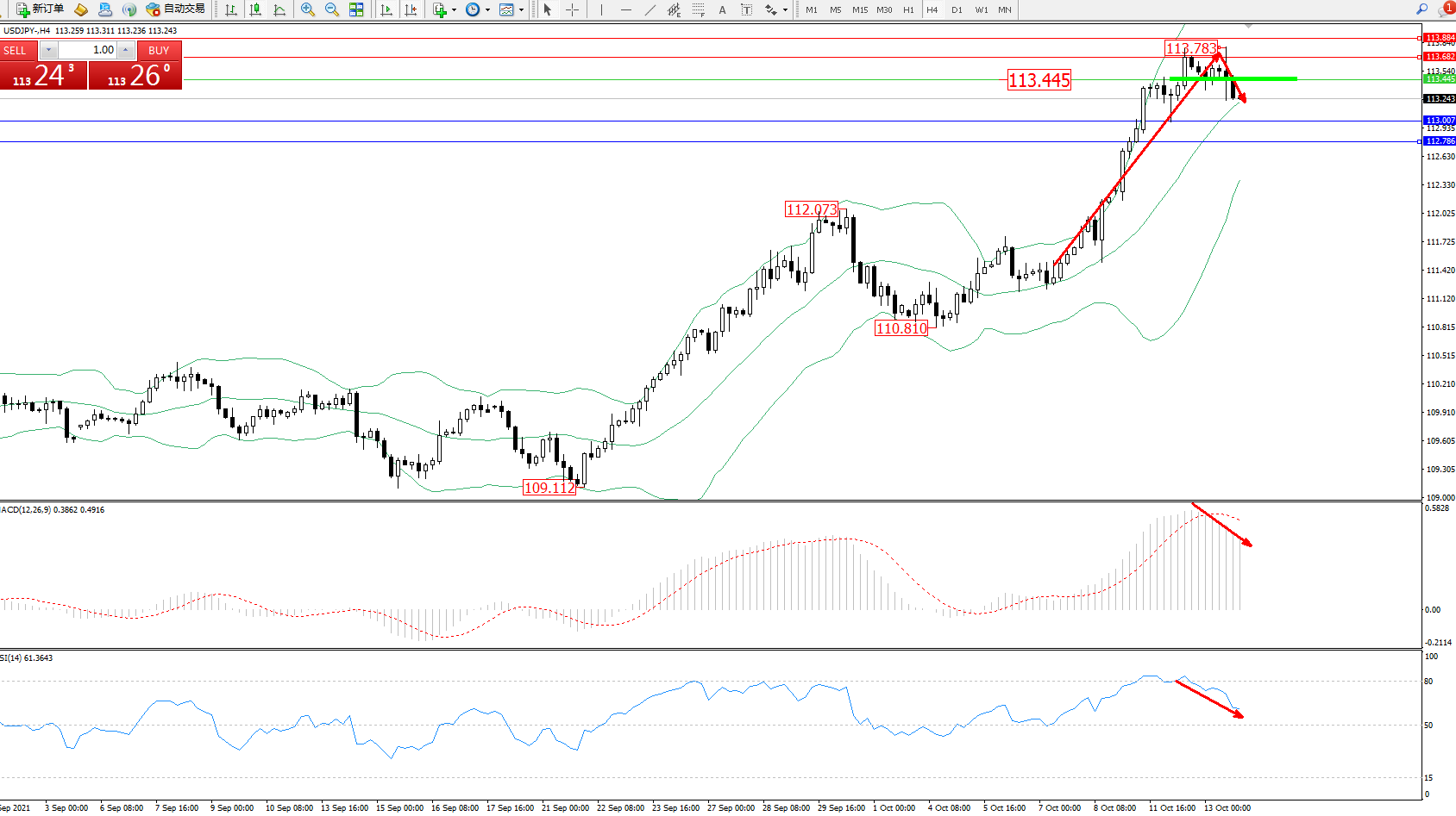 技术点评:多头动力延续布林带指标通道上轨附近持续震荡上扬,高位抵达113.783附近后遇阻回撤,即将触及布林带指标中轨附近节点,短期多头动力开始上行乏力,空头动力伺机入场,布林带指标呈收口走势持续中,MACD指标处于多头区域高位开始整理下行,RSI指标纠结于80均衡线附近弱势整理后开始震荡向下移动;