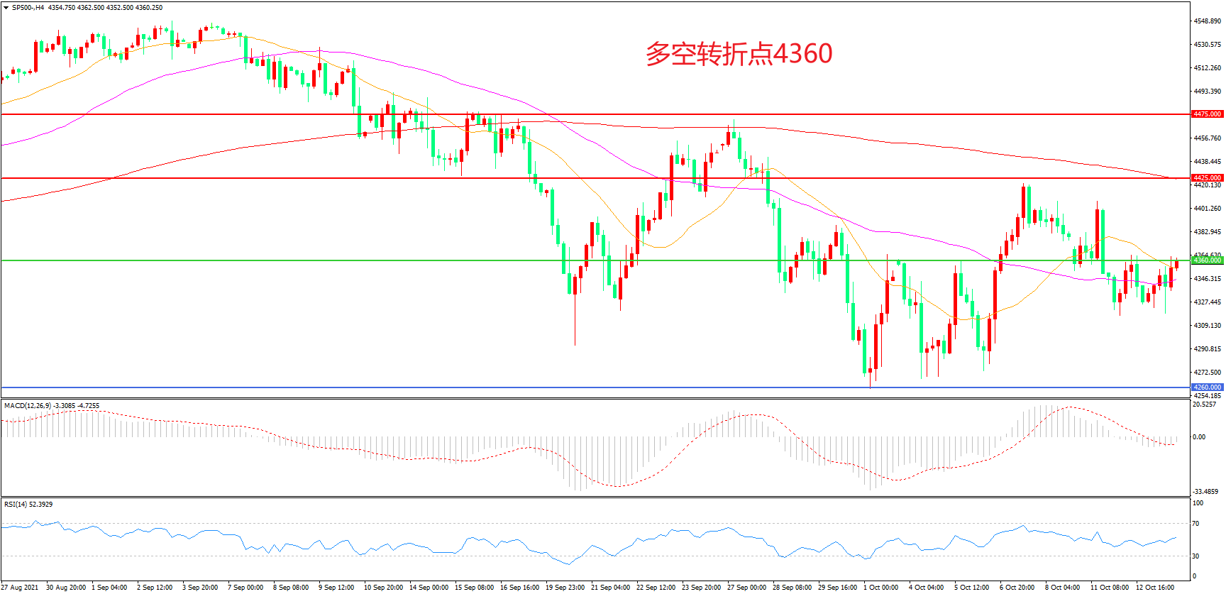 4小时图看,标普500以55周期进行为依托窄幅震荡,整体走势偏弱,4360成为短期多空分水岭,MACD绿柱缩短,RSI指标走平,日内延续震荡概率较大。