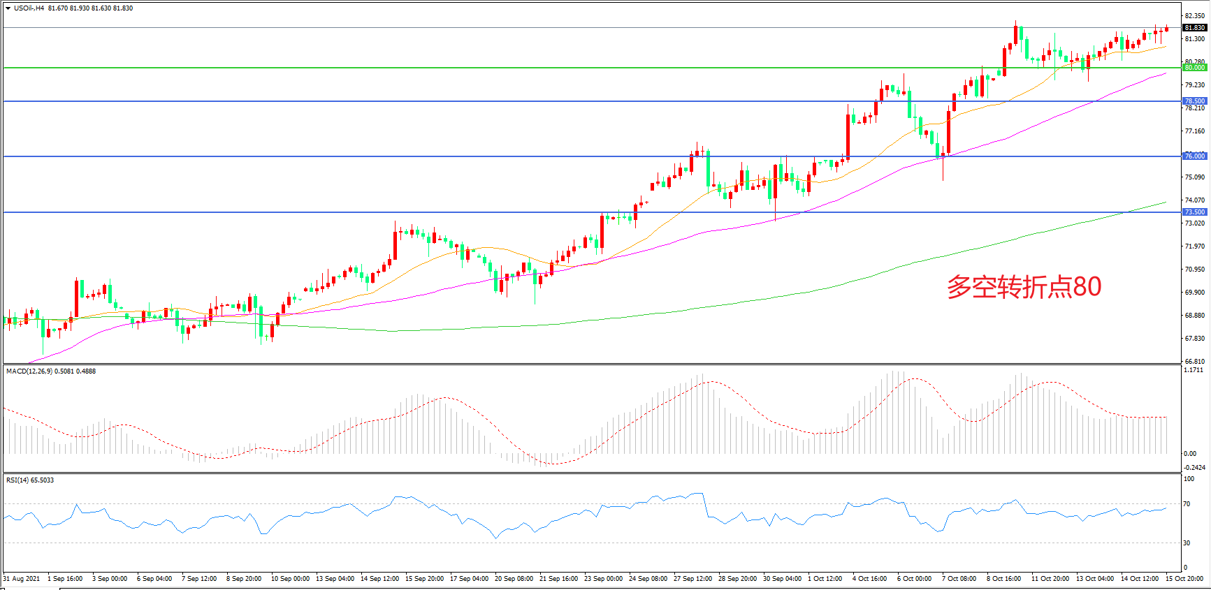 4小时图看,油价整体呈现高位震荡形态,均线系统呈多头排列,MACD红柱缩短,RSI指标走平,日内延续震荡概率较大。