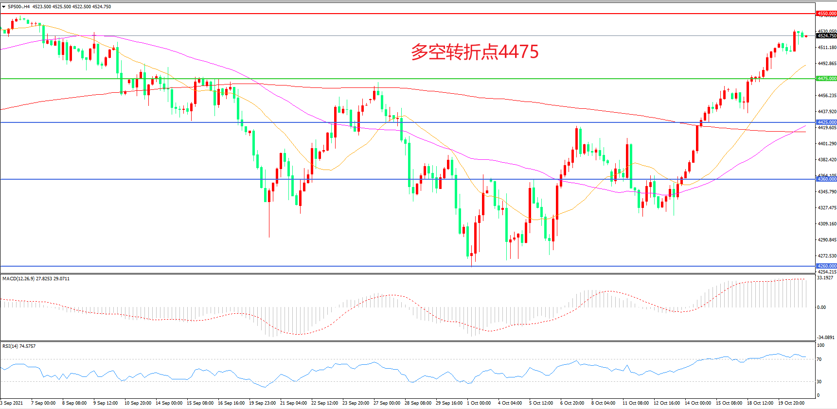 4小时图看,标普500阳线连续拉升,短期表现偏强,均线系统拐头向上,MACD红柱增加,RSI指标走平,日内震荡上行概率较大。