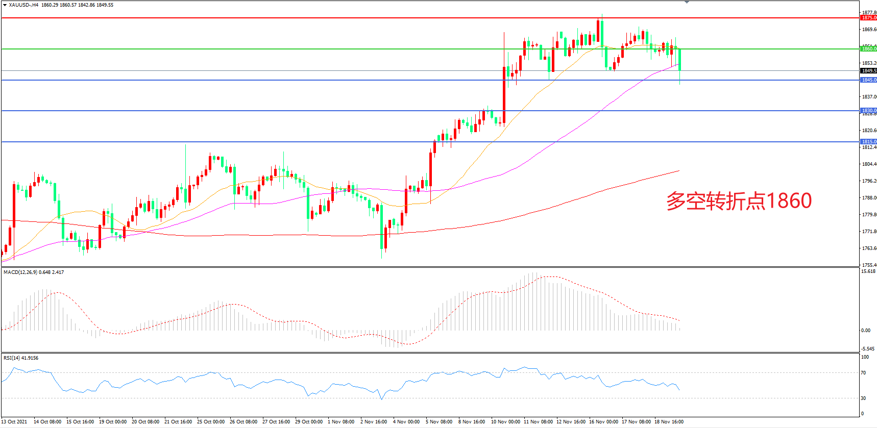 4小时图看,金价在1860一线震荡后长阴破位,短期走势低迷,1845成为下方支撑,1860成为上方阻力,MACD红柱缩短,RSI指标向下,日内震荡下行概率较大。