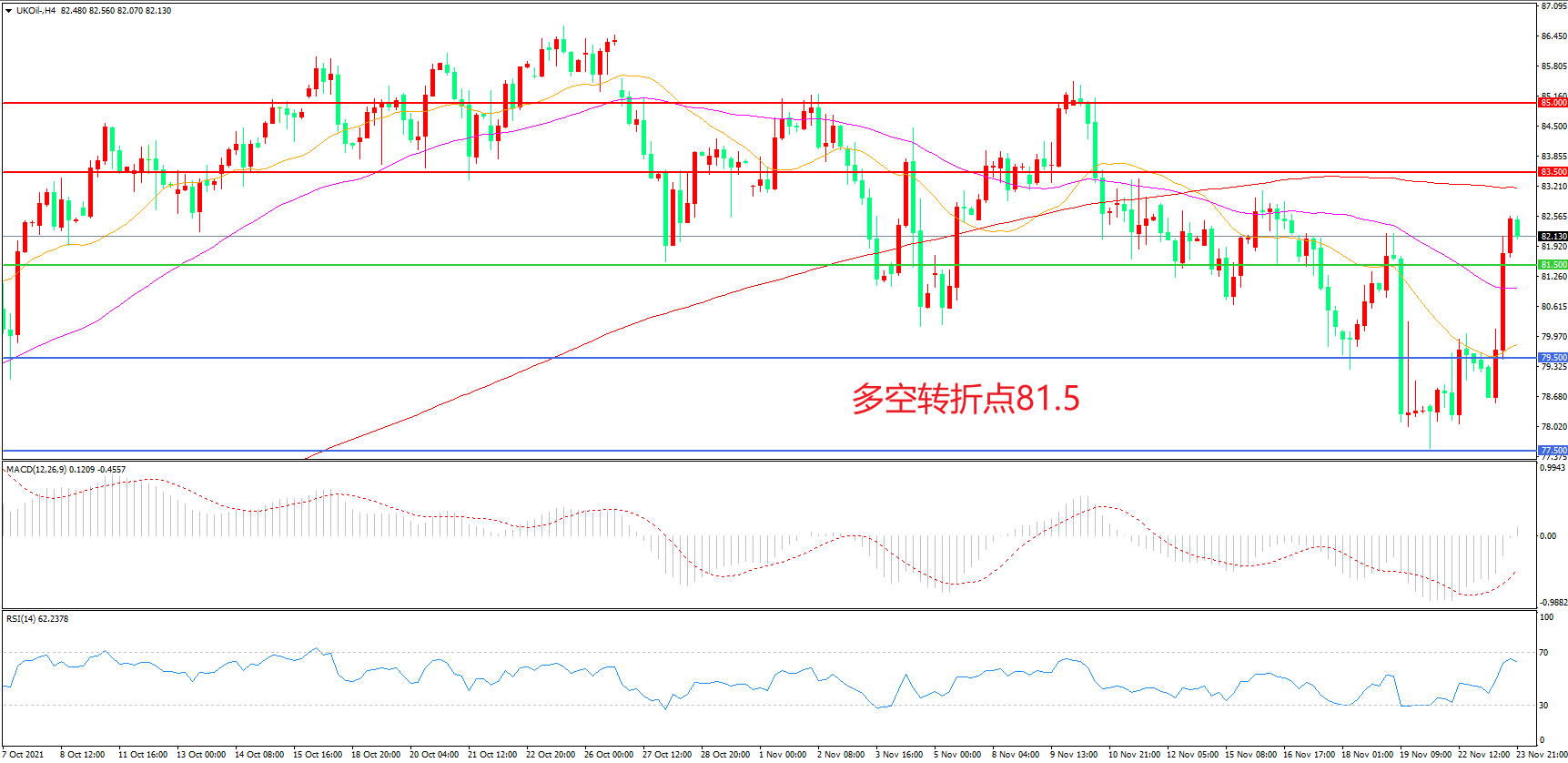 4小时图看,油价长阳拉升,整体表现有所回暖,200周期均线成为上方阻力,81.5成为多空分水岭,MACD红柱增加,RSI指标走平,日内震荡上行概率较大。
