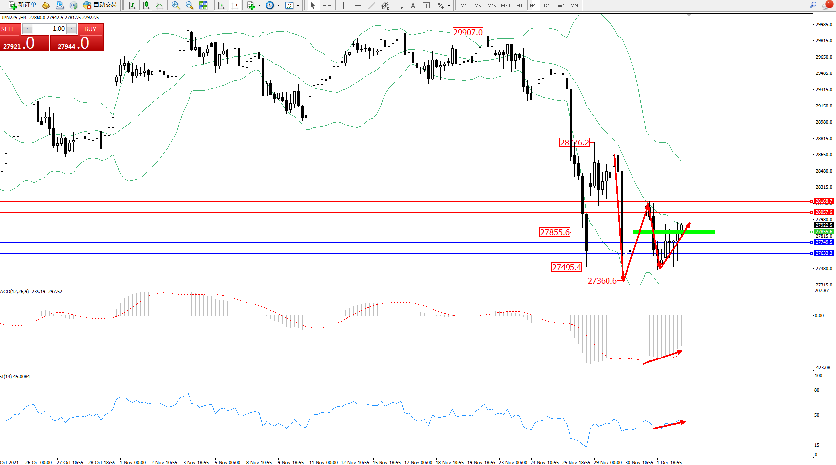技术点评:长时间维持在布林带指标通道中下轨区间持续震荡向下移动,低位抵达27360附近后得到支撑开始反转上移,触及布林带指标中轨附近短期遇阻震荡,短期波幅空间逐渐收窄,触及中轨附近节点后有短暂迹象上移迹象,布林带指标呈收口走势后有缓慢收口且继续下行迹象,MACD指标处于空头区域低位多头动力缓慢上移,RSI指标处于空头区域持续整理上扬;