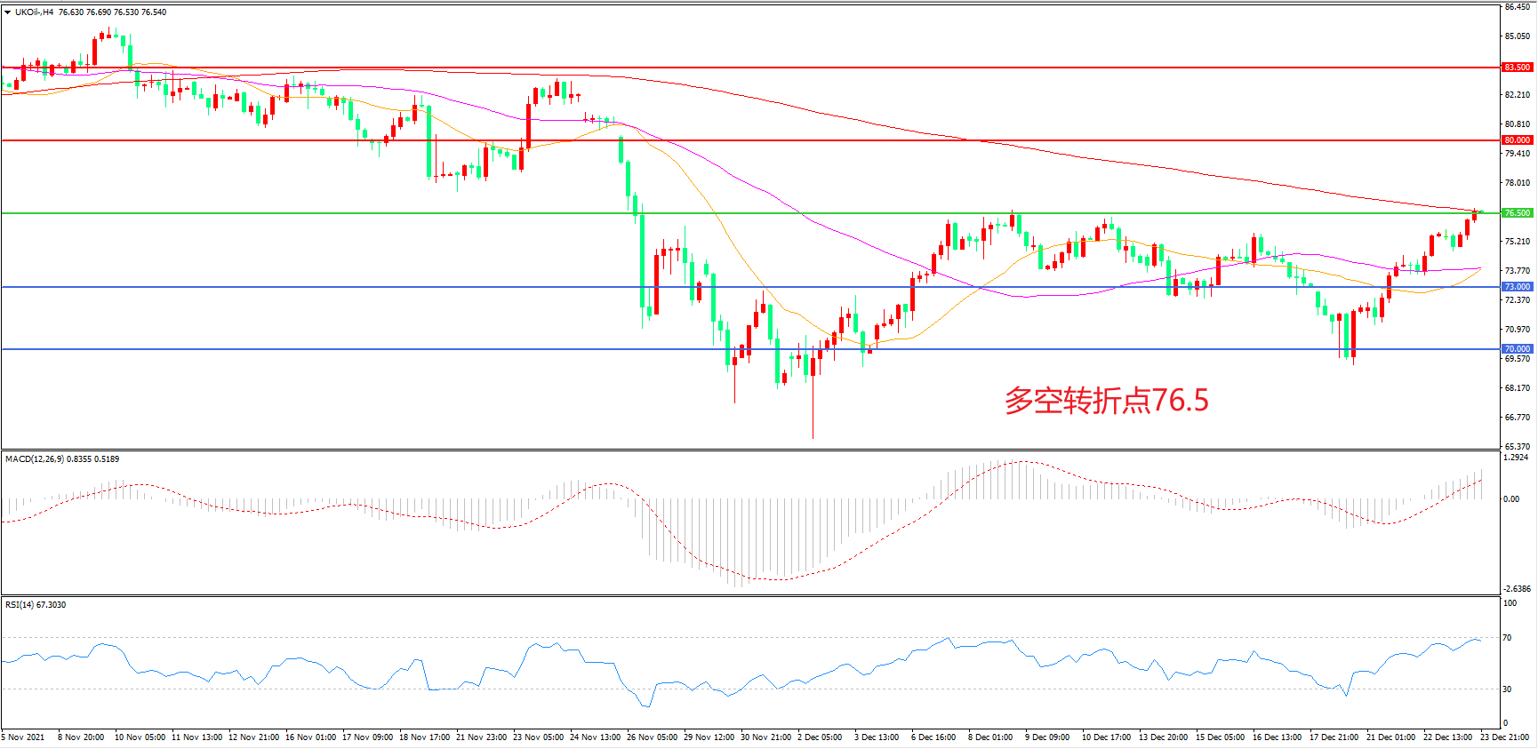 4小时图看,油价于76.5美元附近企稳后,短期表现偏强,200周期均线突破在即,21周期均线向上形成金叉,MACD红柱增加,RSI指标走平,日内震荡上行概率较大。