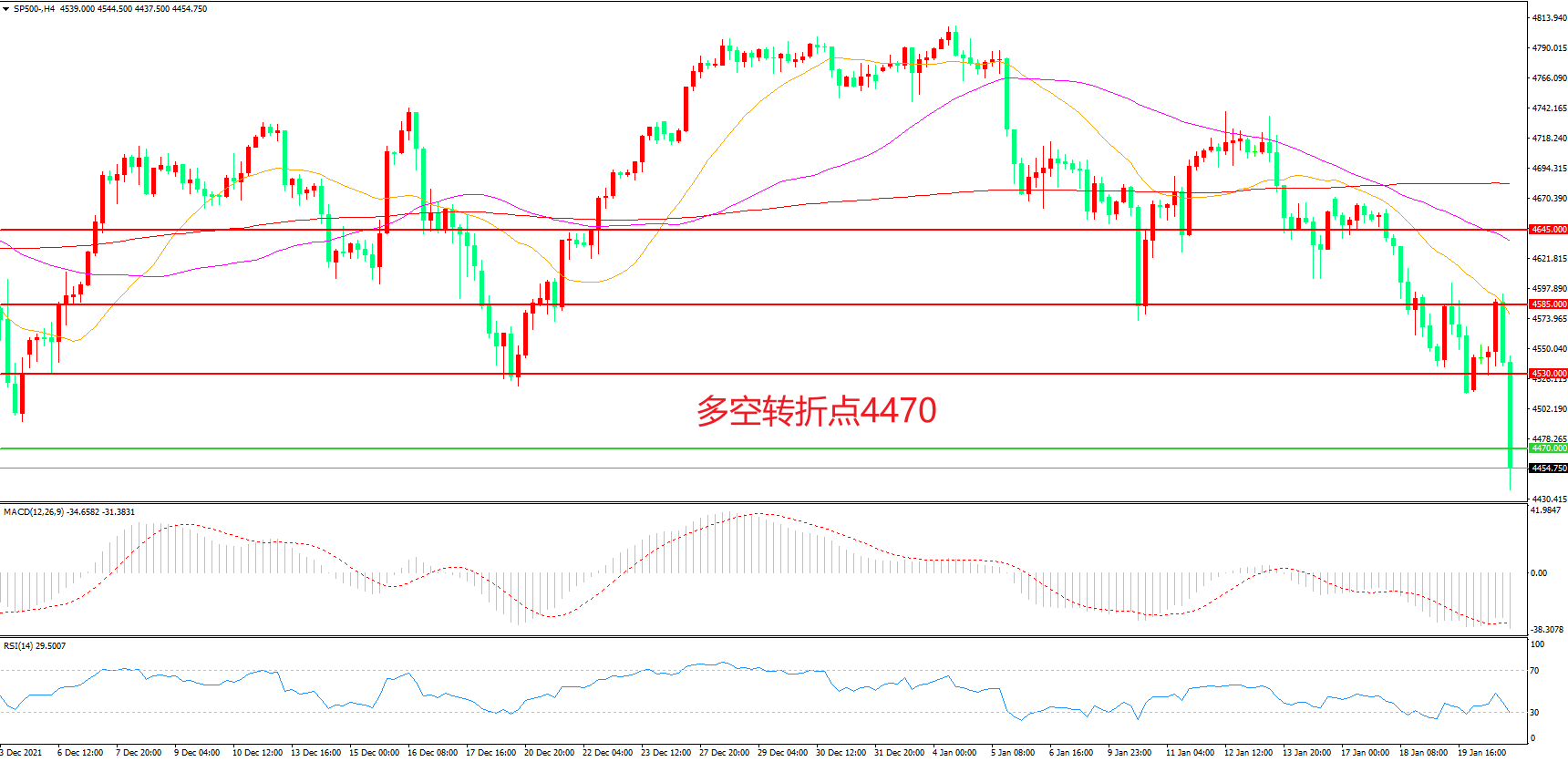 4小时图看,标普500长阴连续下破,短期走势偏空,均线系统拐头向下,MACD绿柱增加,RSI指标走平,日内震荡下行概率较大。