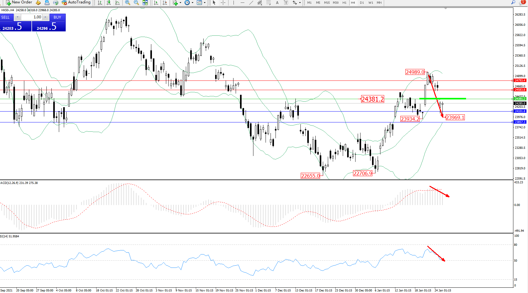 恒指HK50 ——4小时K线图显示: