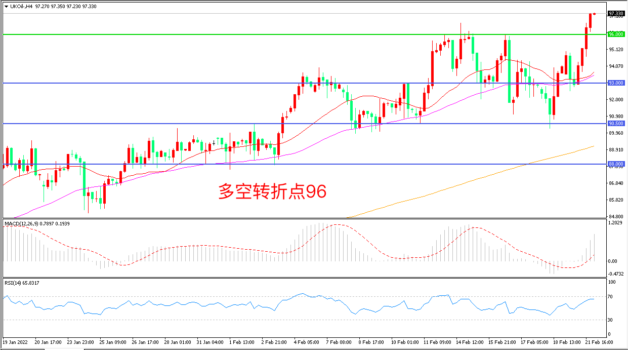 4小时图看,油价强势突破96美元一线,短线走势偏强,均线系统成为下方支撑,MACD红烛增加,RSI指标走平,日内震荡上行概率较大。