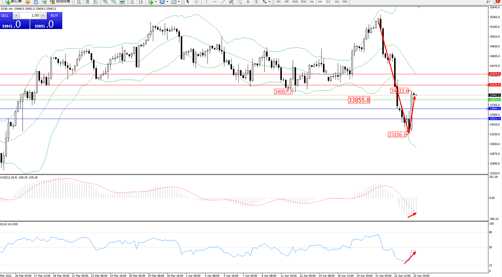 技术点评:空头动力延续布林带指标下轨附近强势下挫,低位抵达33226附近节点后急速拉升,短期低位多头动力开始上扬,布林带指标呈张口走势持续中,MACD指标处于空头区域维持震荡,RSI指标处于空头区域持续震荡向上移动;