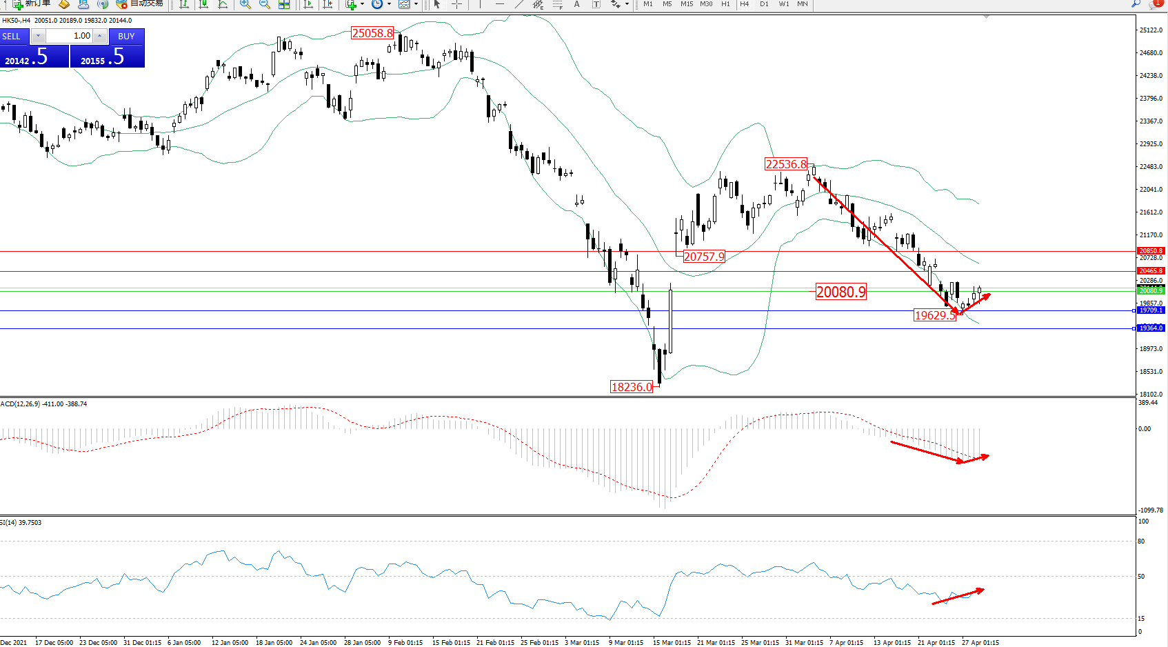 技术点评:空头动力延续布林带指标通道中下轨区间持续震荡下挫,低位抵达19629位置节点后开始整理缓慢上移,多头动力伺机入场,布林带指标呈缓慢张口走势不断向下移动,MACD指标处于空头区域维持整理后有上移迹象,RSI指标处于空头区域维持整理上移;
