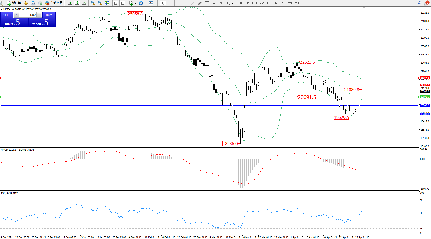 香港恒生指数4月29日(周五)收盘上涨813.22点,涨幅4.01%,报21089.39点;中央政治局会议释放积极信号,港股暴力反弹上扬超800点,恒生科技指数大涨9.96%,盘中收复4500点。大型科技股涨幅十分亮眼,美团、阿里巴巴、京东均大涨超15%,腾讯、百度大涨超10%;恒生科技ETF(513130)盘中一度触及涨停,成交近9亿元,势头强劲。今日,中共中央政治局召开会议,强调要促进平台经济健康发展,完成平台经济专项整改,实施常态化监管,出台支持平台经济规范健康发展的具体措施。不少机构认为,恒生科技指数此前已超跌进入价值区间,中长期配置价值凸显。