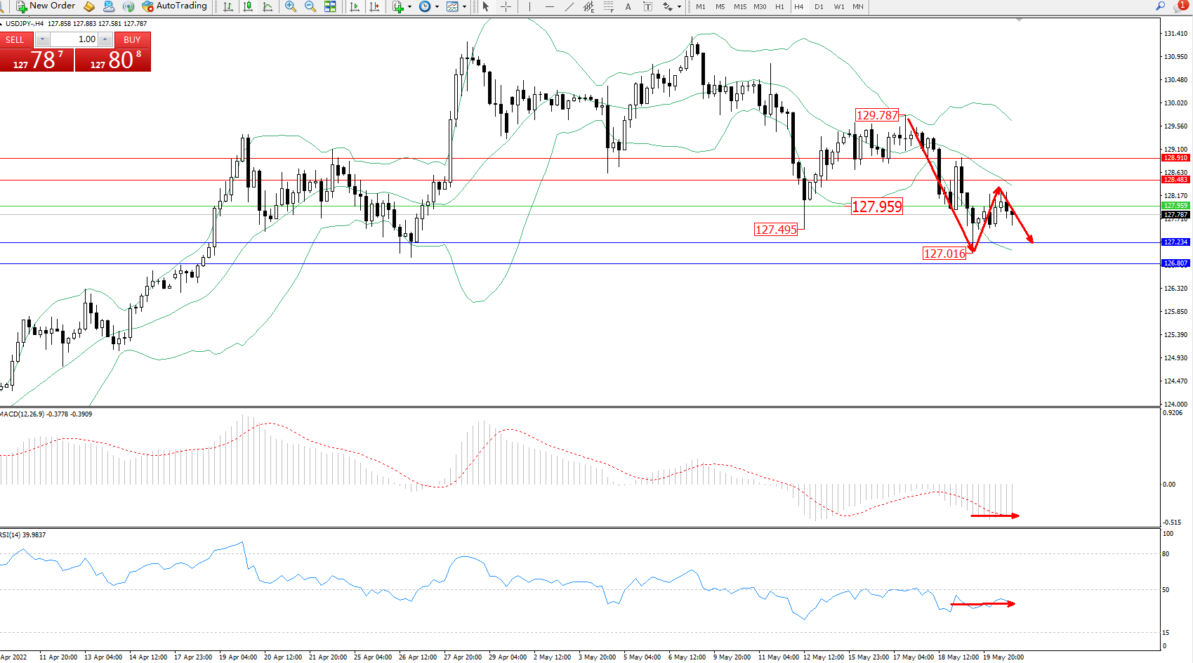交易策略:127.959下方看跌,目标127.234、126.807