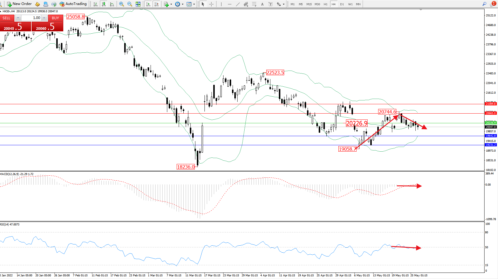香港恒生指数5月26日(周四)收盘下跌55.07点,跌幅0.27%,报20116.2点;港股震荡收跌,三大指数盘中均跌超1%,相较于A股走势稍弱,全国稳经济大盘会议以后多地快速抛出实质性利好消息。恒生科技指数跌0.24%。大型科技股走势继续分化,快手涨1.57%,小米、网易上涨,阿里巴巴跌1.5%,美团、京东小幅收跌;中国香港4月贸易帐录得-366亿港元,预期-340;进口同比增长2.1%,预期-6.9%;出口同比增长1.1%,预期6.9%。