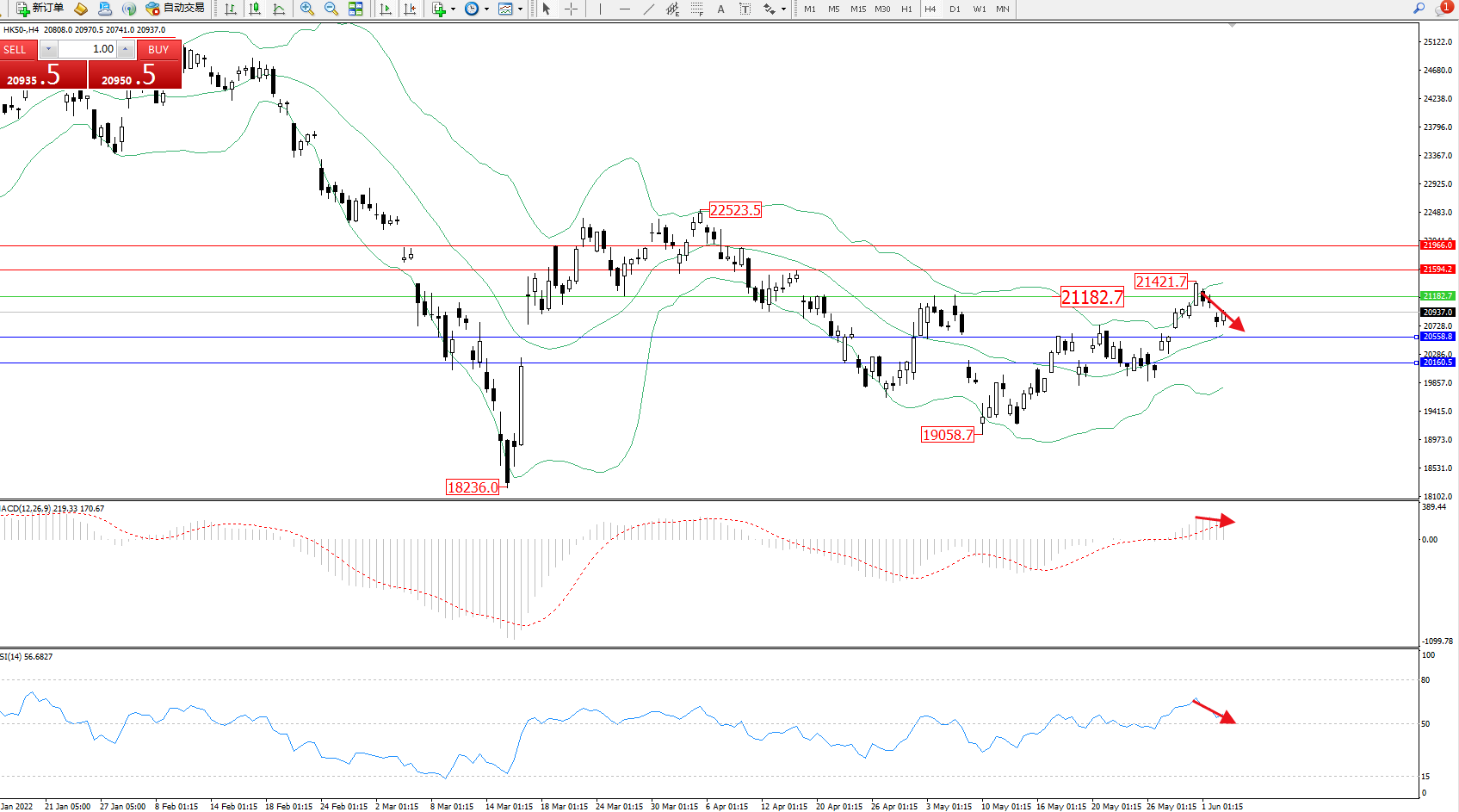香港恒生指数6月2日(周四)收盘下跌212.81点,跌幅1.0%,报21082.13点;受隔夜美股下跌影响,港股全天表现疲弱,因节前效应大市成交萎靡。恒生科技指数跌0.8%,大型科技股普跌,阿里巴巴跌2.43%,香港中华煤气(0003.HK)公布,已通知环境局煤气公司计划于8月1日调整煤气收费,这次调整后,煤气公司承诺未来两年不会加价。
