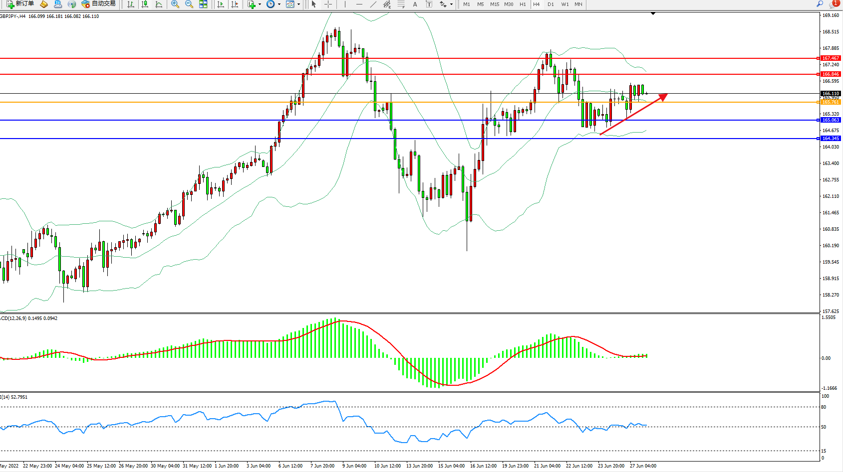 4小时图看:长时间维持在布林带指标通道内宽幅震荡平移,期间多次触及中下轨区间整理后开始缓慢上行,布林带指标呈收口走势中,MACD指标处于0轴线附近徘徊,RSI指标处于50均衡线附近弱势整理;
