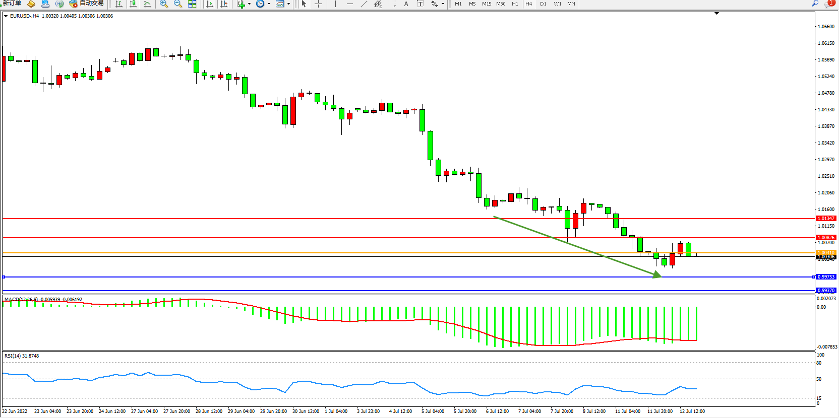 欧元美元EURUSD—4小时K线图显示: