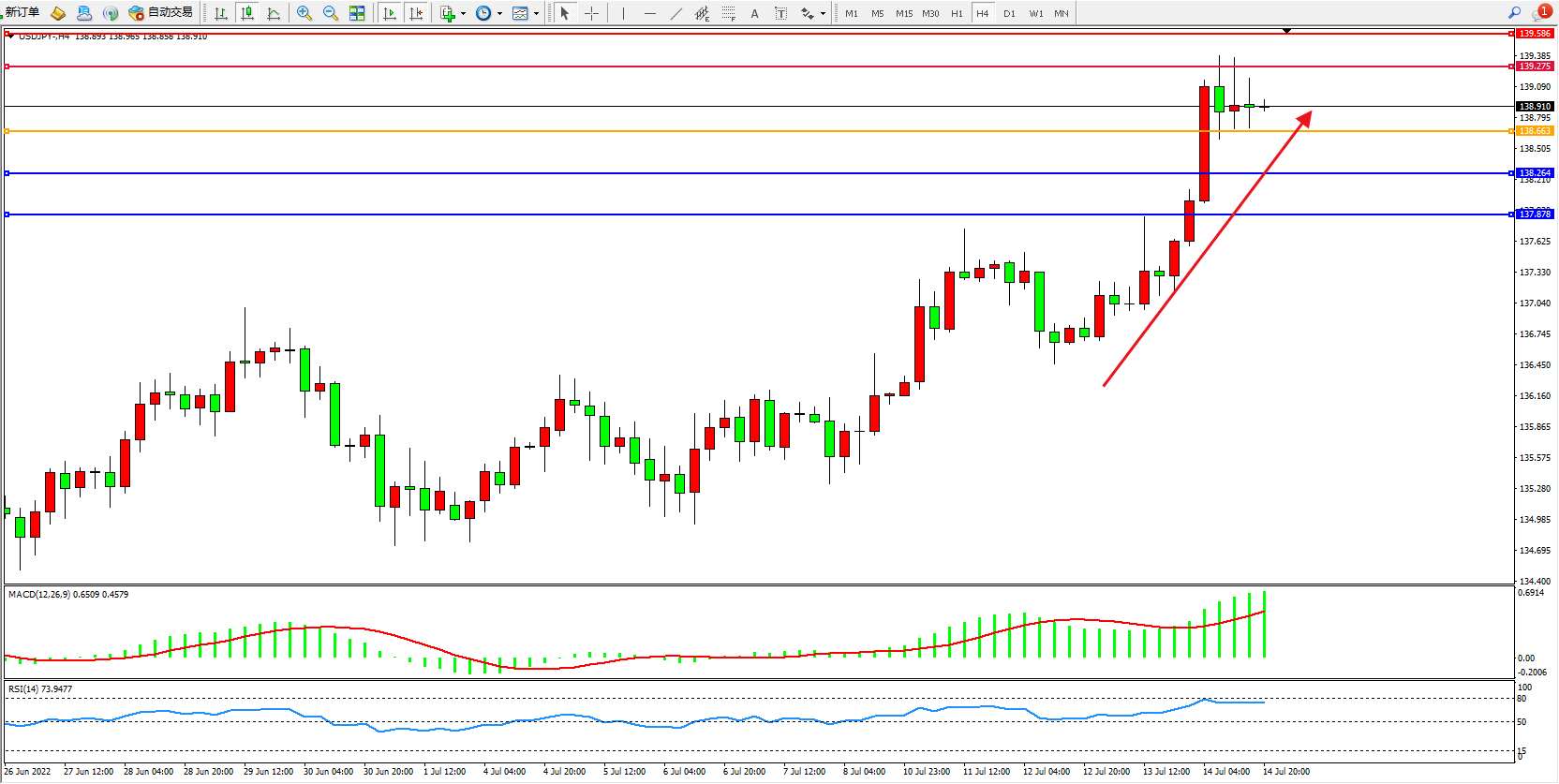 美元日圆USDJPY——4小时K线图显示:
