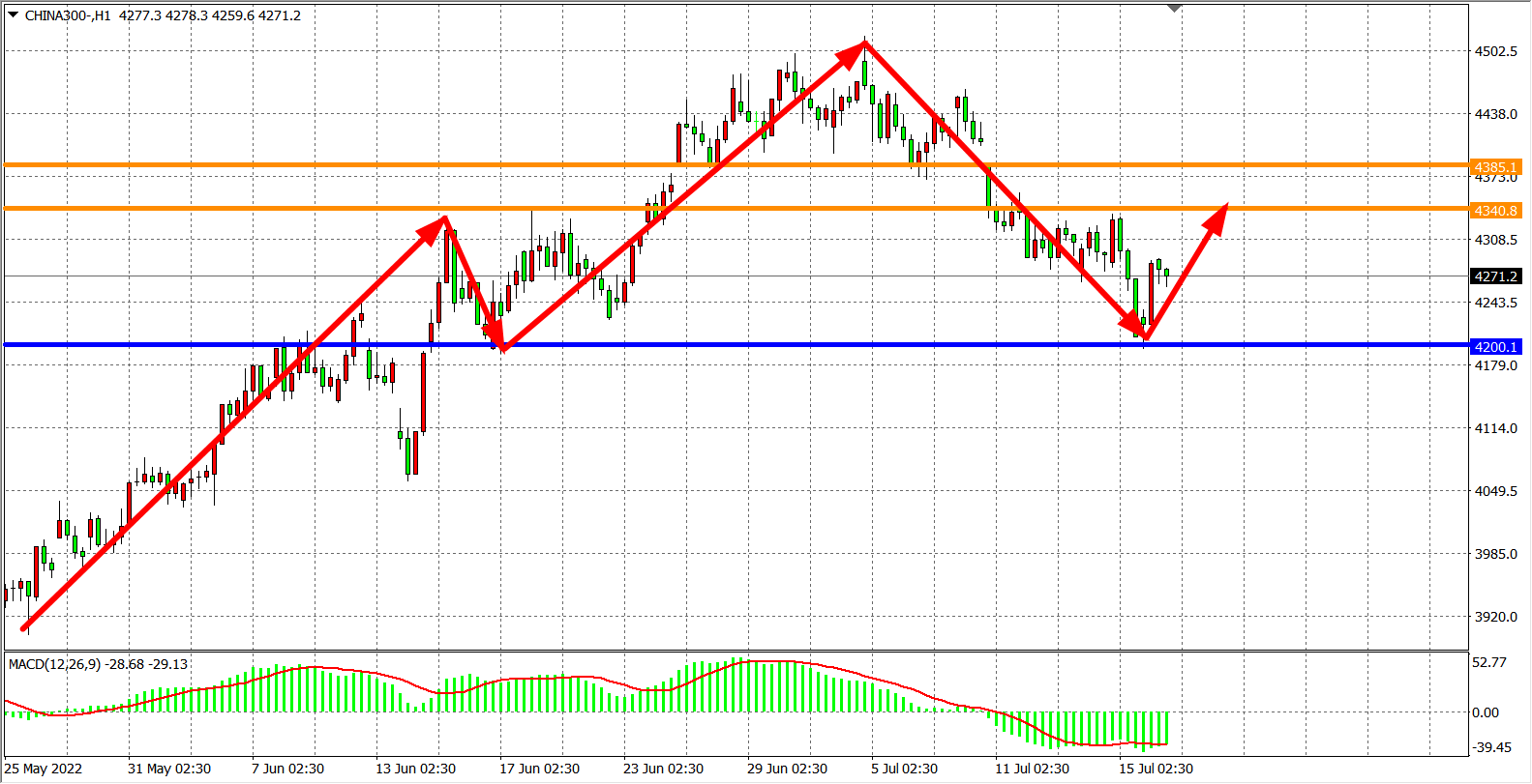 1小时图看,沪深300在4200之上获得止跌反弹,MACD于零轴之下开始缩量,预示行情有望展开反弹,日内在4200之上看反弹为主,目标4340-4385