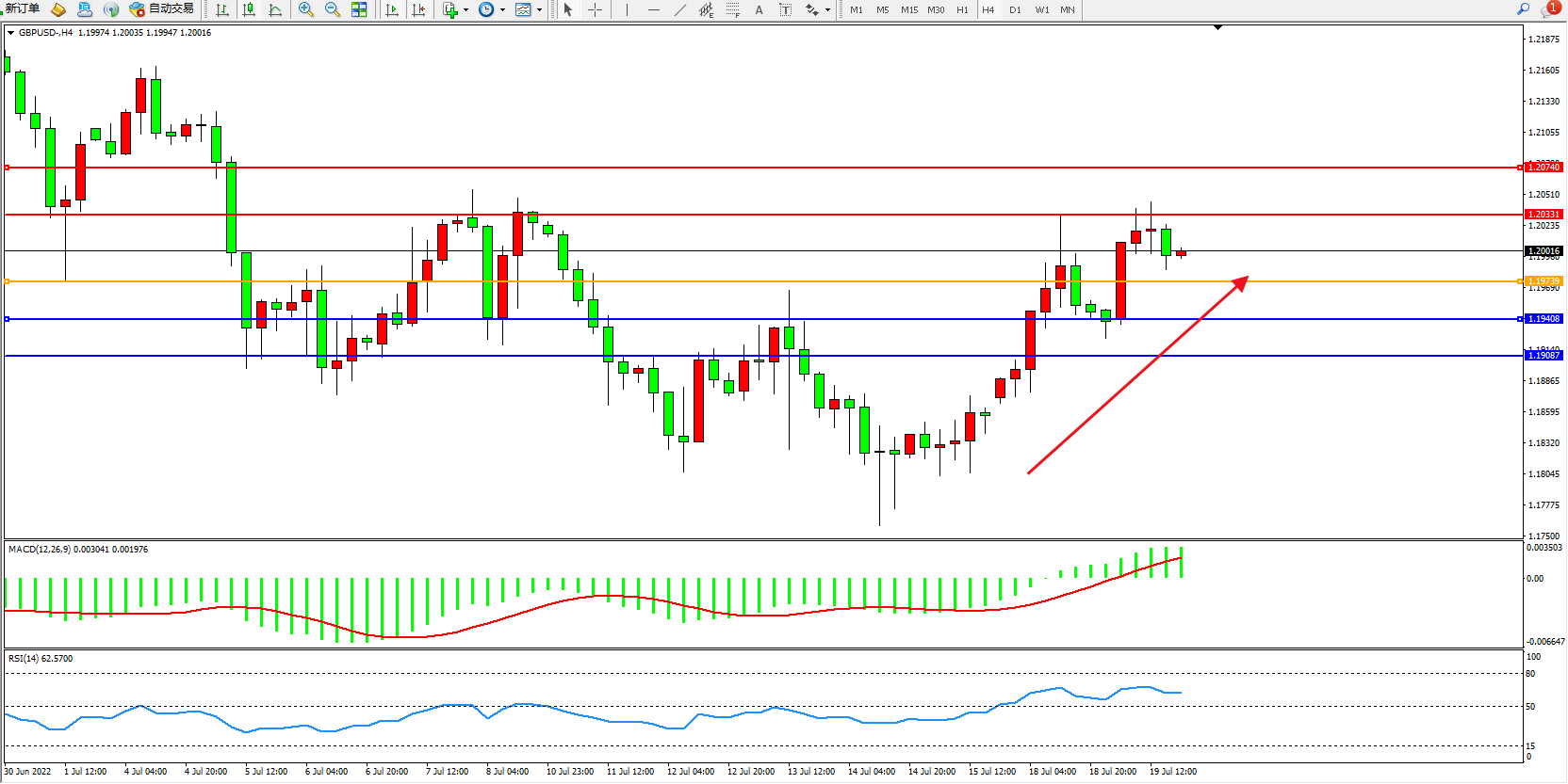 交易策略:1.19739上方看涨,目标1.20331、1.20740