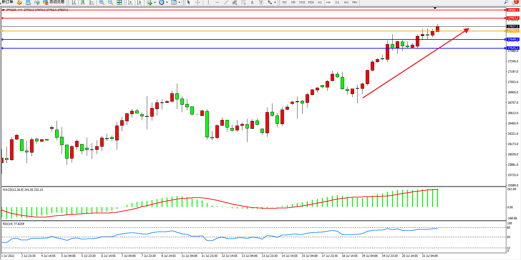 日经225指数7月21日(周四)收盘上涨99.24点,涨幅0.36%,报27779.50点。日本央行维持目前处于最低水平的利率不变,日本央行下调今年的经济增长预期,以支持其认为疲弱的经济需要持续支撑的观点。