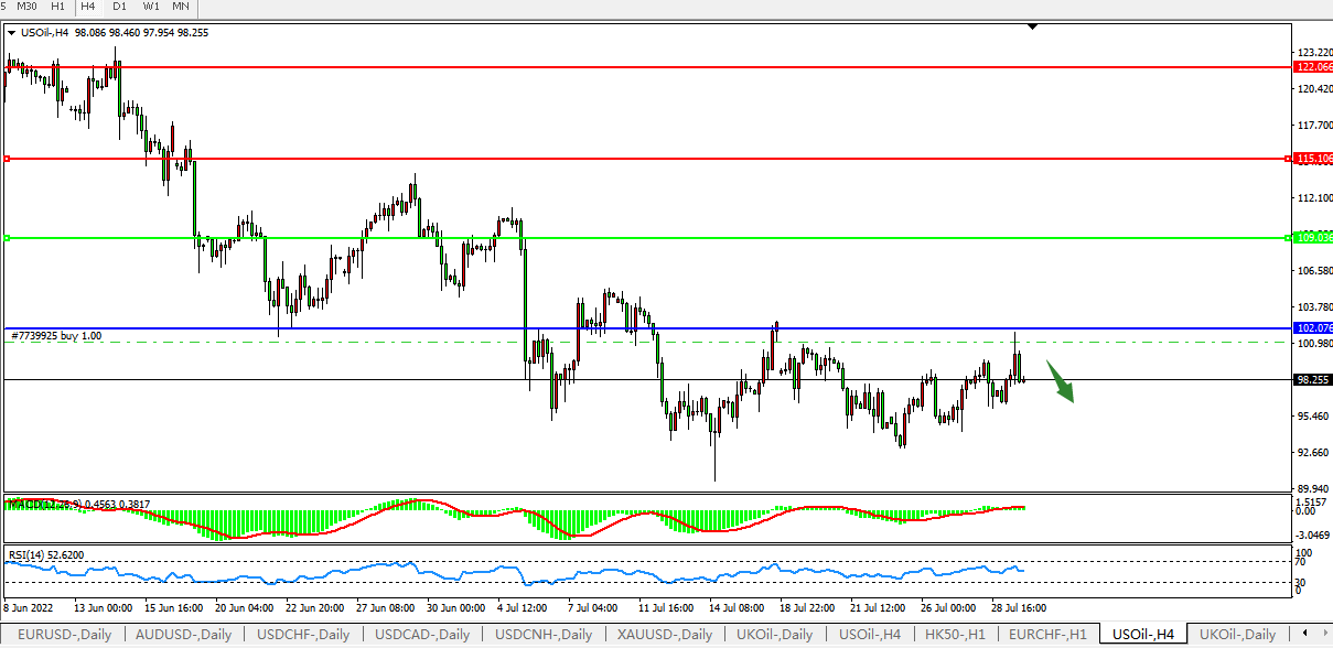 4小时图看:周五夜盘价格迅速上行后快速回落, MACD量能柱0轴附近缩量,RSI指标走势窄幅整理,短期价格反弹后继续下行概率较大。
