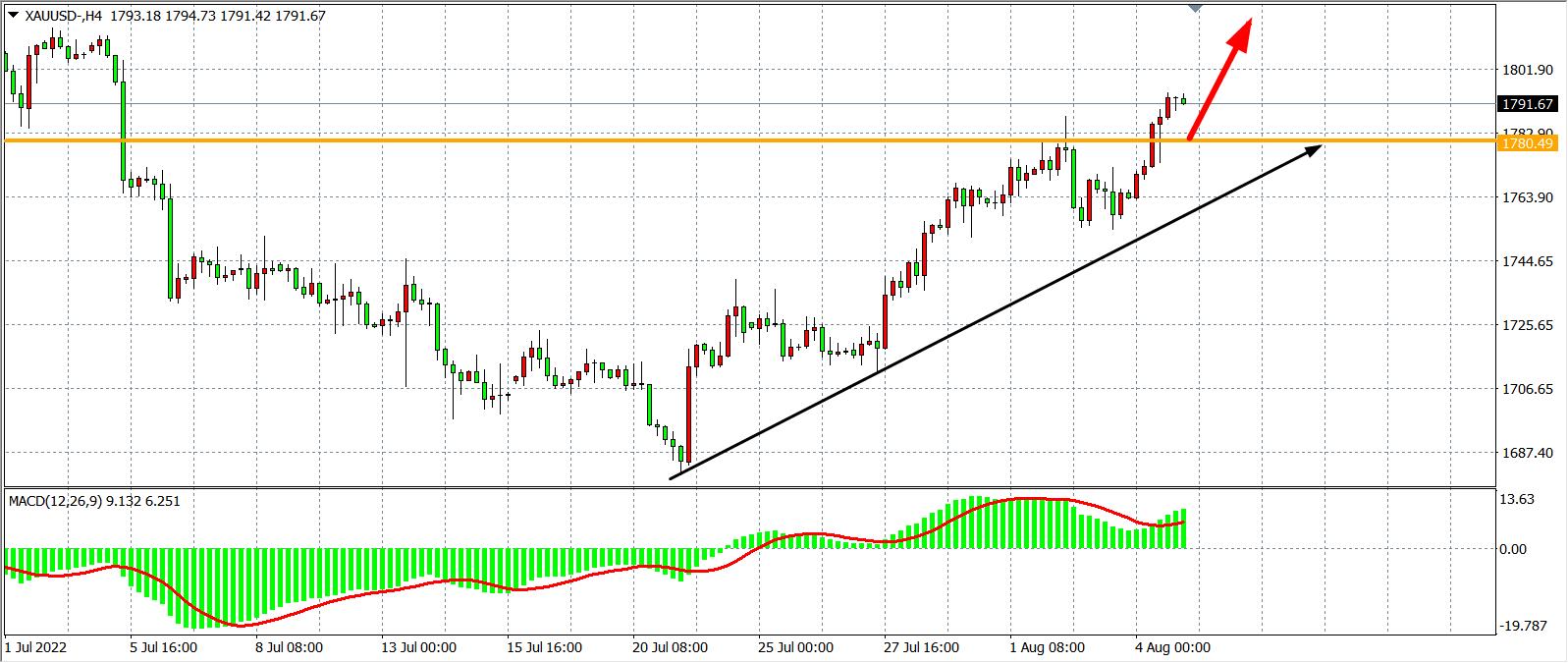 周四(8月4日) 上周美国初请失业金人数上升到26万人,接近一年以来最高水平,表明劳动力市场继续放缓,同时美联储官员透露降息线索,认为9月份加息50个基点的可能性较大,美元指数加速下行,10年期美债收益率跌破2.7%关口,现货黄金突破1790美元/盎司,续刷7月5日以来新高,收涨1.47%。今日非农就业数据将成为市场焦点,若该数据走好,需谨防黄金高位受阻。