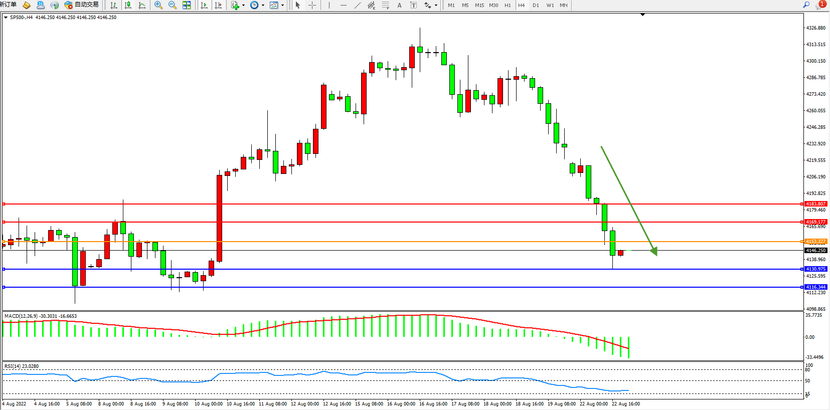 标普500指数8月22日(周一)收盘下跌87.63点,跌幅2.07%,报4140.85点;市场关注重点是美联储主席鲍威尔周五在杰克森霍尔央行研讨会上的讲话,以进一步了解联储在未来加息方面可能有多激进。