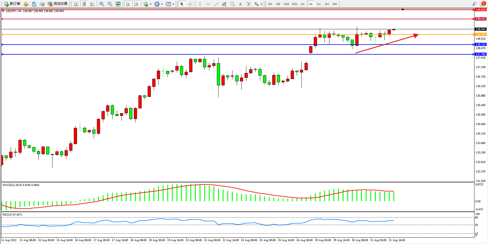 4小时图看:高位短期波幅空间逐渐收窄,多头动力纠结高位弱势徘徊,MACD指标处于多头区域维持整理平移,RSI指标处于多头区域维持弱势徘徊;