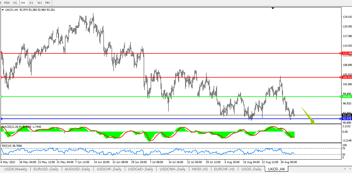 4小时图看:短线价格持续弱势,中期图形结构转弱, MACD量能柱0轴下小幅放量,RSI整理偏弱,短期油价反弹后再度下行概率较大。