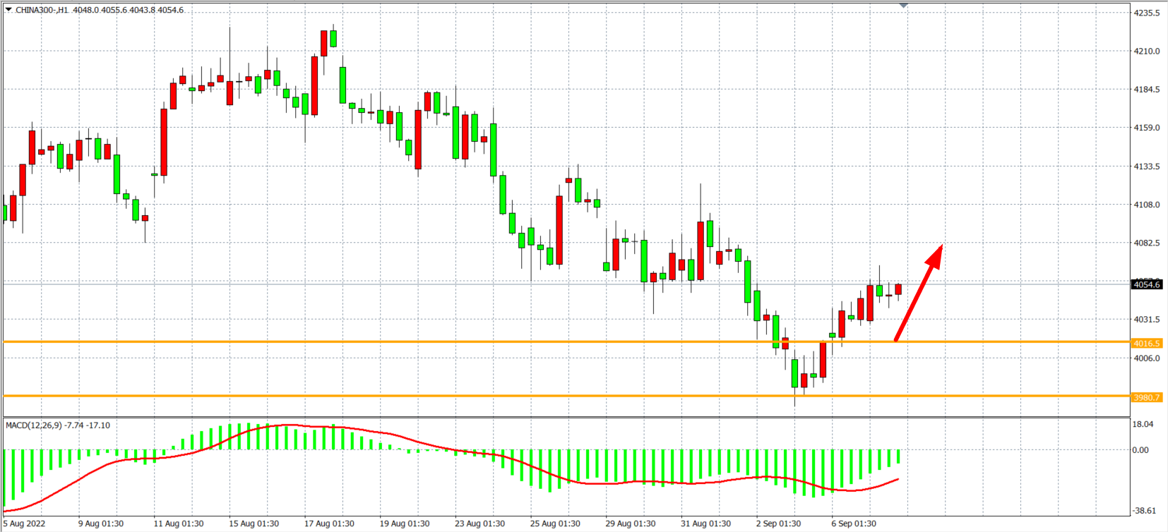 1小时图看,沪深300延续反弹走势,在4016点之上走强,MACD于零轴之下量能持续缩小,显示趋势或延续反抽,目前短线支撑依旧看4016,日内在该位之上继续看反弹,上方目标4080-4150
