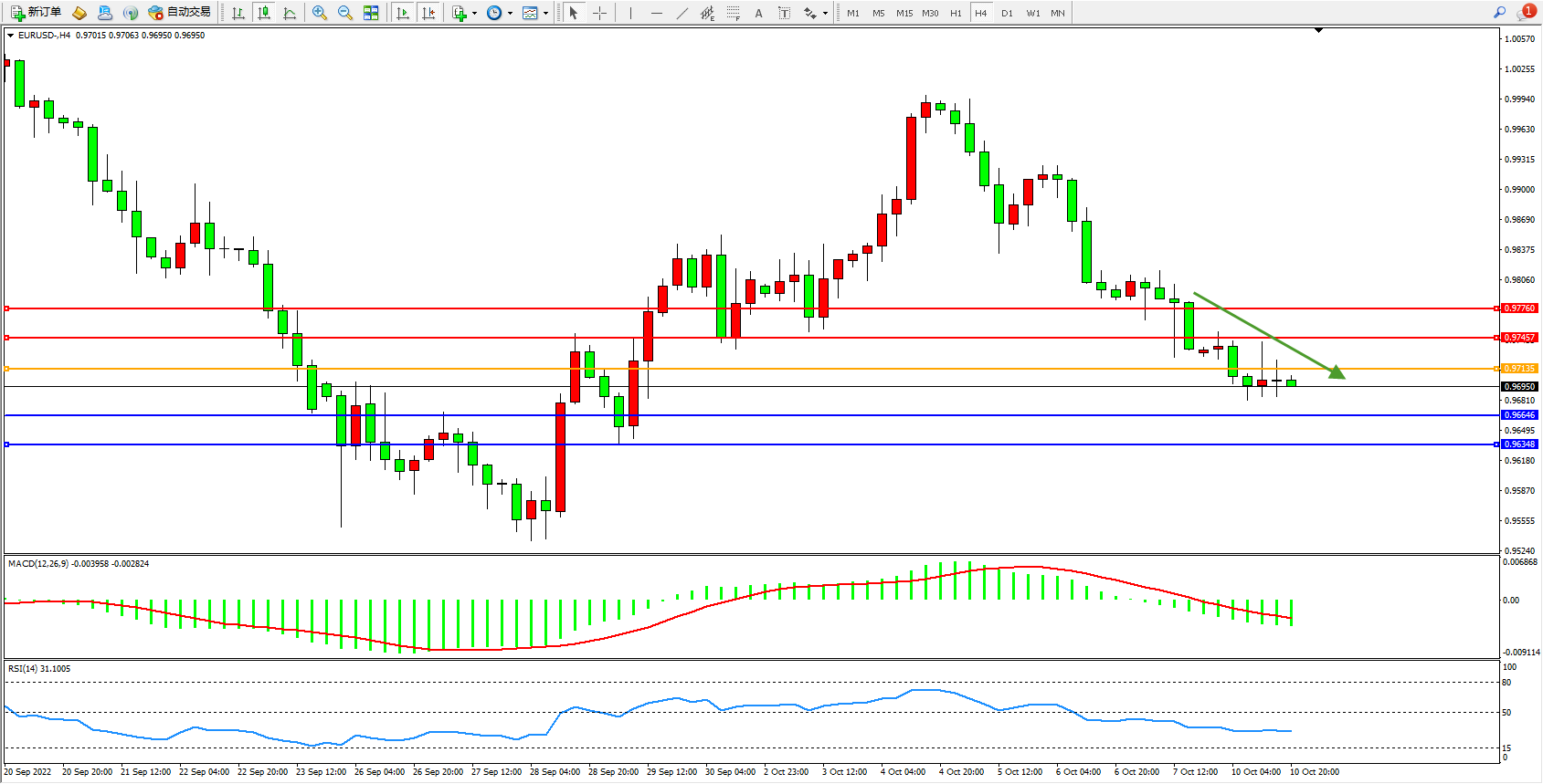 欧元美元EURUSD—4小时K线图显示: