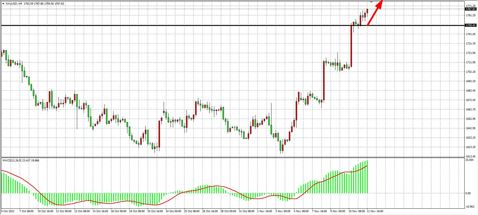4小时图看,金价再度突破1720美元的压力位,最高涨至1760美元之上,同时MACD于零轴之上大幅放量走高,预示行情有进一步走强动能,当前支撑已上移至1750附近,日内在该位之上继续看涨为主,上方目标1775-1790