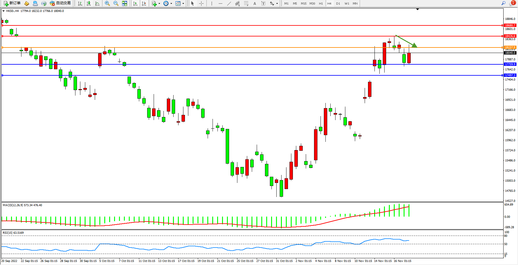 香港恒生指数11月17日(周四)收盘下跌210.82点,跌幅1.15%,报18045.66点;港股午后跌幅明显收窄,恒指尾盘近乎翻红,最终收跌1.15%18000点失而复得,恒生科技指数跌2.2%险守3700点,盘中曾一度大跌超5%。大型科技股普遍下挫,与动视暴雪停止合作,网易大跌9%,美团跌近6%,南下资金全日净流入74.08亿港元,大市成交额为1525亿港元。