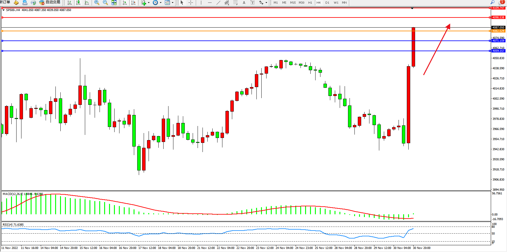 标普500指数11月30日(周三)收盘上涨119.37点,涨幅3.02%,报4077.00点;美国第三季度实际GDP年化季率较初值上修0.2%至2.9%。GDP增速表现比初步估值更好,反映了消费者支出和商业投资的上修。