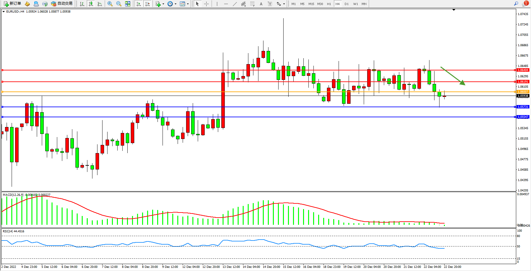 欧元美元EURUSD—4小时K线图显示: