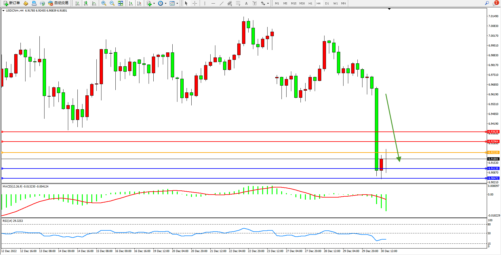美元人民币USDCNH——4小时K线图显示: