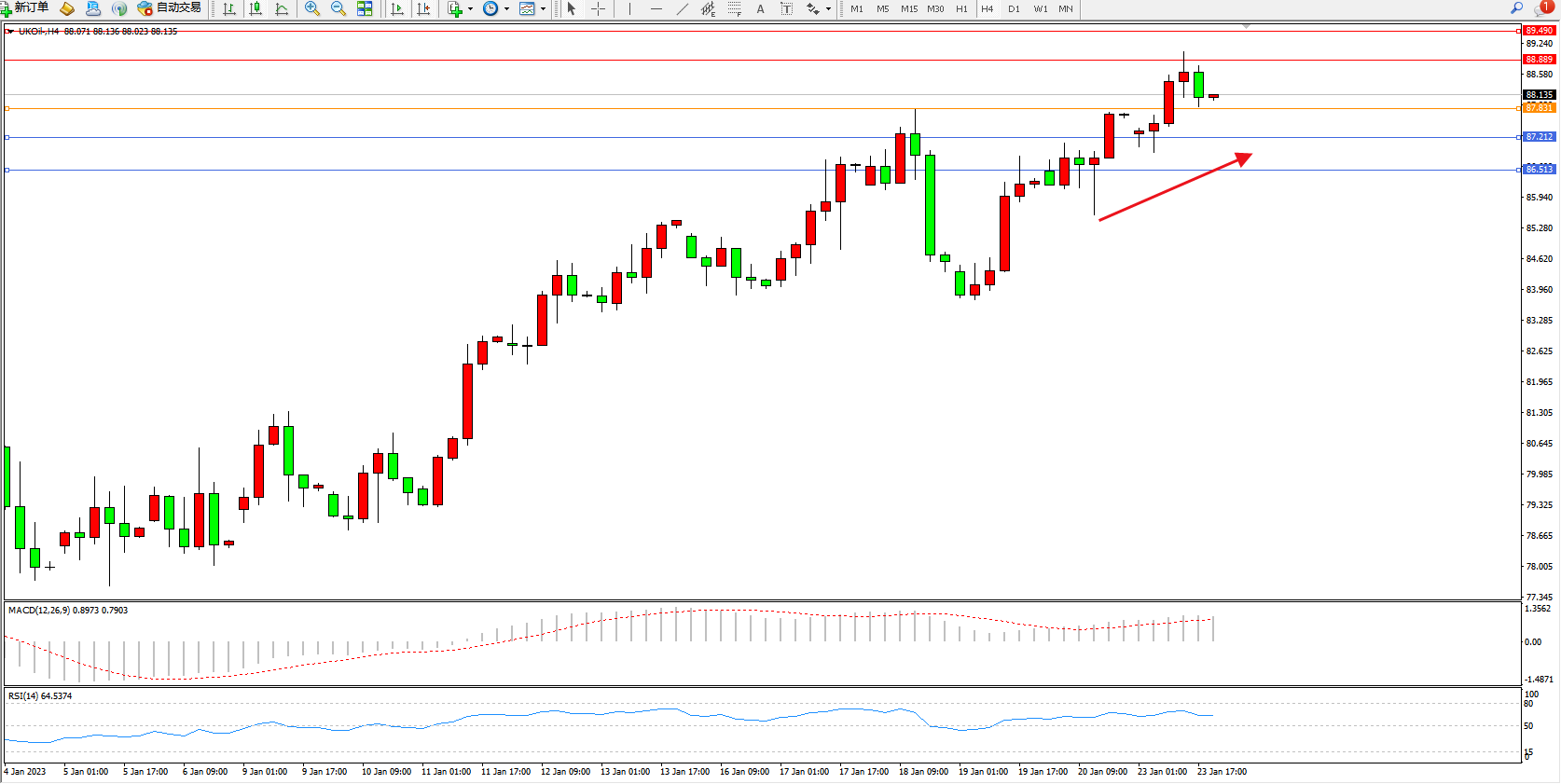 4小时图看:多头动力延续上行趋势通道不断震荡上扬,短期看涨情绪笼罩,市场多头不断攀升中,MACD指标处于多头区域窄幅整理,RSI指标处于多头区域徘徊;
